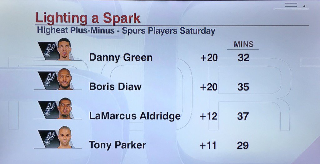 而主帥 Gregg Popovich 也表示為了因應勇士的小球陣容,特地將 Boris Diaw 拉上先發(本季第三次先發),也使得生涯先發達 1382 場的老隊長 Tim Duncan,生涯第三度板凳出賽,上一次已經是 2010 年了;而若是上一次 Duncan 主場擔任替補,那更得回溯至 2004 年了。或許這也印證了賽前早晨 Tony Parker 接受採訪時所說的:「我們會做出些改變。」